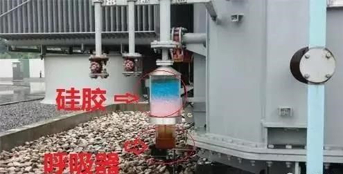 B.在油的呼氣通道上加裝硅膠罐,變壓器呼吸通過硅膠,排出的水分被吸收,水分到一定程度,硅膠的顏色會由藍變紅,此時需更換硅膠。圖中所示。