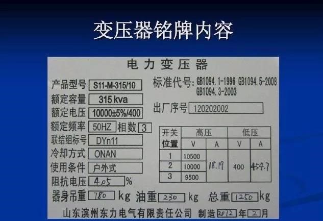 變壓器一二次額定電壓,額定容量,接線組別,一次、二次額定電流,變阻抗電壓,分接開關(guān)調(diào)整電壓范圍、使用環(huán)境條件、變壓器油的型號及重量等。